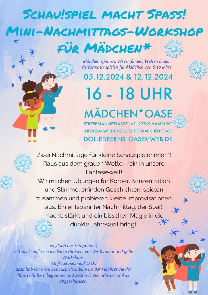 Ihr könnt Euch in der Mädchen*Oase vor Ort anmelden, uns eine Mail schreiben an dolledeerns_oase@web.de oder uns anrufen 040 431 88 433, wir geben Euch dann Bescheid, ob an diesem Tag noch Plätze frei sind. Für die Ausflüge benötigen wir außerdem eine Einverständniserklärung Eurer Eltern. Danke für Euer Verständnis!